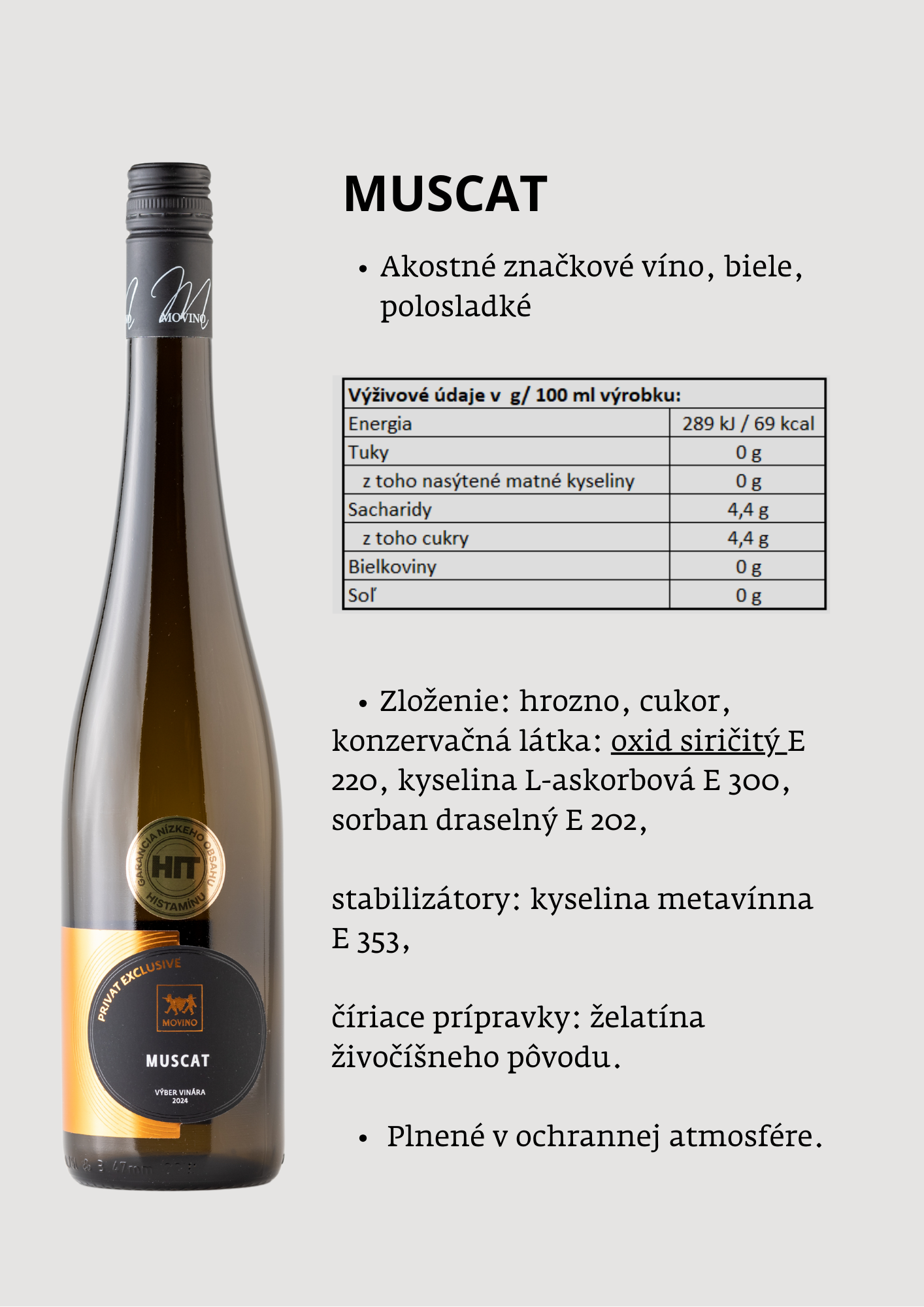 Jemná zelená farba so zlatistým podtónom a aróma bielej vinohradníckej broskyne, ktorá sa jemne prelína s tónmi žltého melónu. Opulentná, zaguľatená chuť, umocnená príjemným cukrom, prináša bohatý zážitok, v ktorom je broskyňa prítomná v každom dúšku.